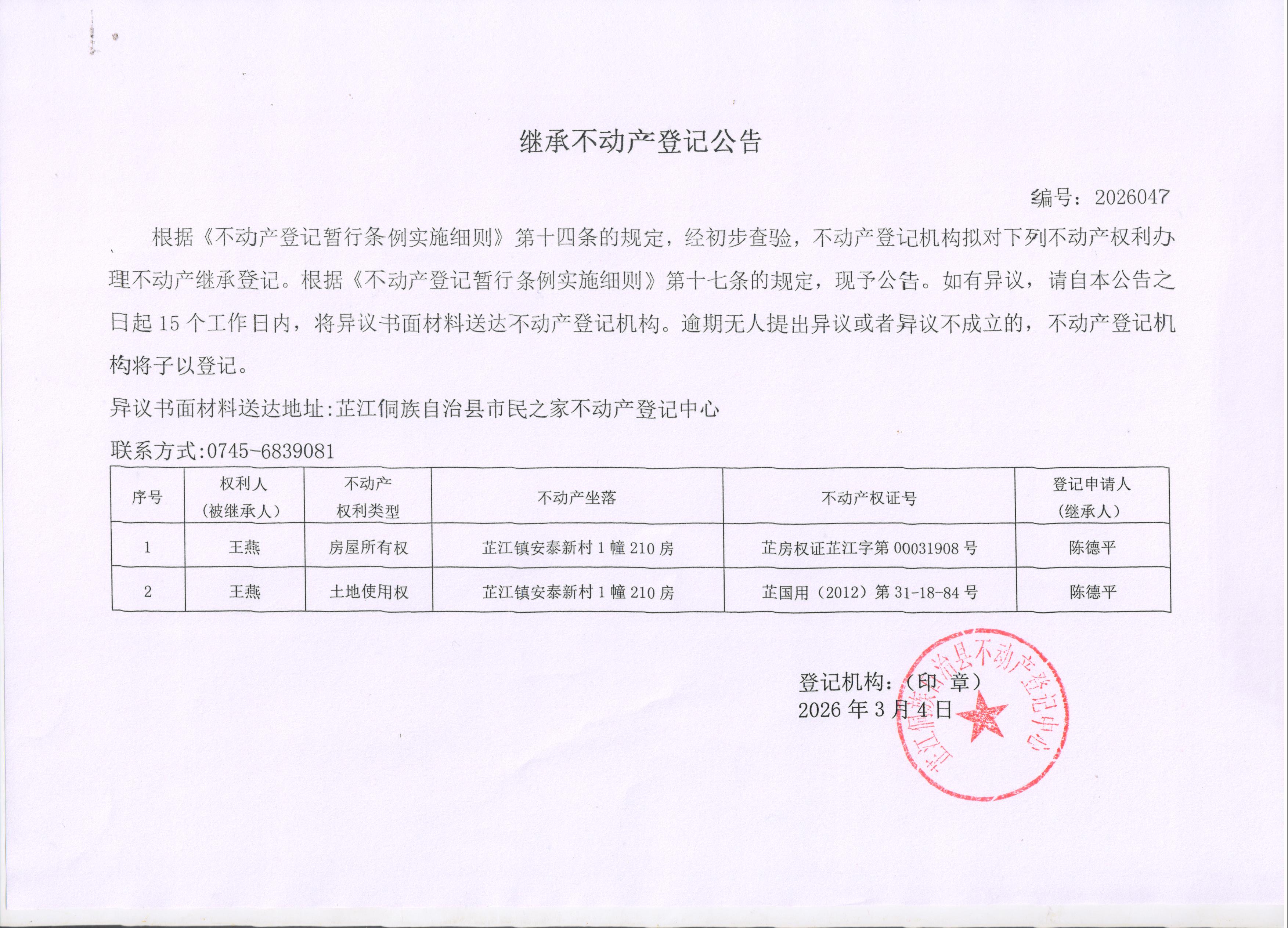继承不动产登记公告 编号:2026047