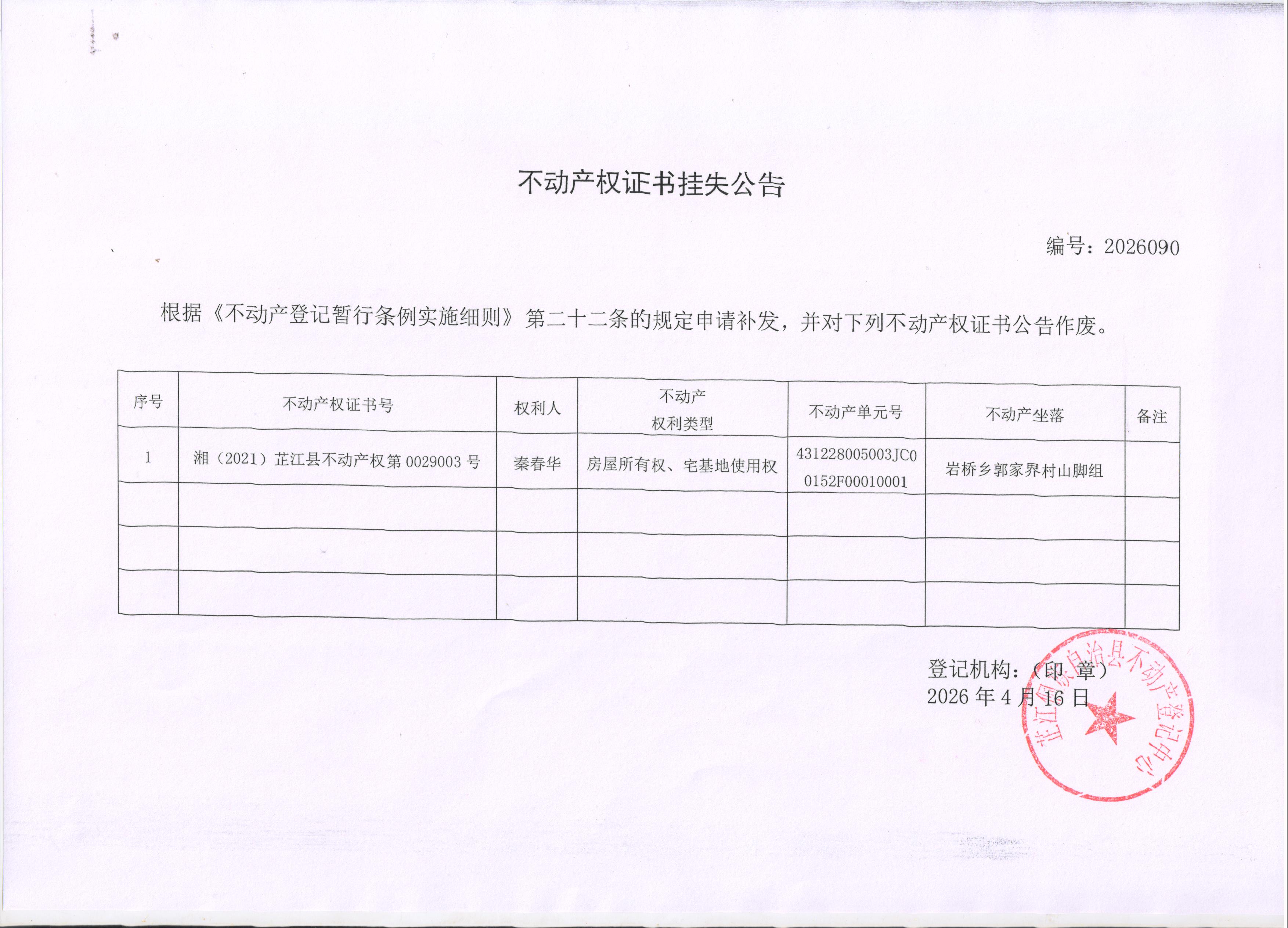 不动产权证书挂失公告 编号:2026090
