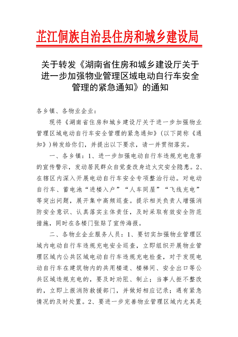 关于转发《湖南省住房和城乡建设厅关于进一步加强物业管理区域电动自行车安全管理的紧急通知》的通知