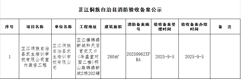 芷江侗族自治县武生培训学校有限公司室内装修工程消防验收备案公示