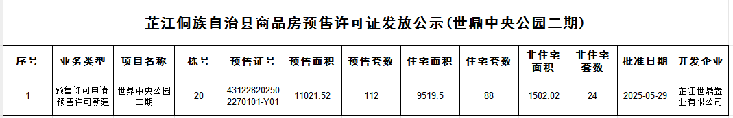 芷江侗族自治县商品房预售许可证发放公示(世鼎中央公园二期)
