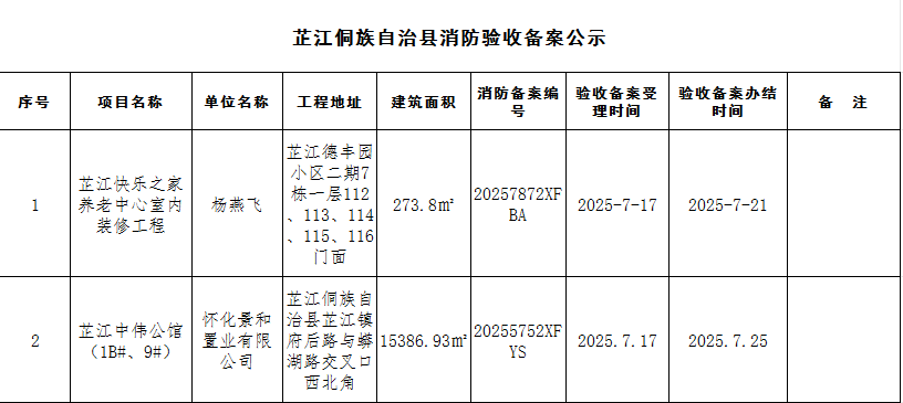 芷江县快乐之家养老中心室内装修工程、芷江县中伟公馆(1B#、9#)消防验收备案公示