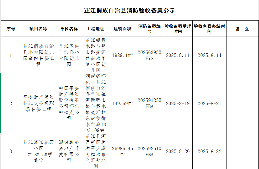 芷江侗族自治县小太阳幼儿园室内装修工程、平安财产保险芷江支公司职场装修工程、芷江滨江花园小区12#、13#、15#楼建设消防验收备案公示