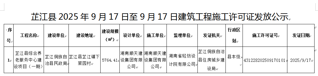 芷江县2025年9月17日至9月17日建筑工程施工许可证发放公示