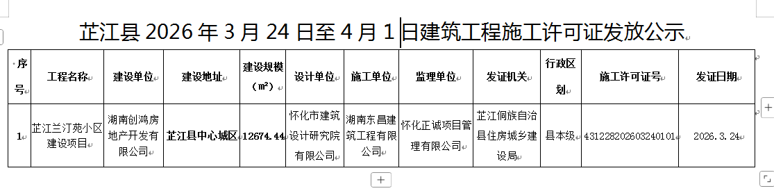 芷江县2026年3月24日至4月1日建筑工程施工许可证发放公示