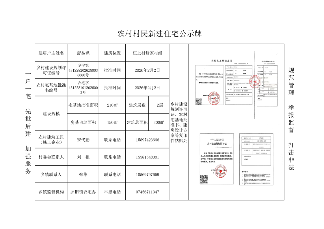 农村村民新建住宅公示牌-庄上村舒家村组-舒易谋
