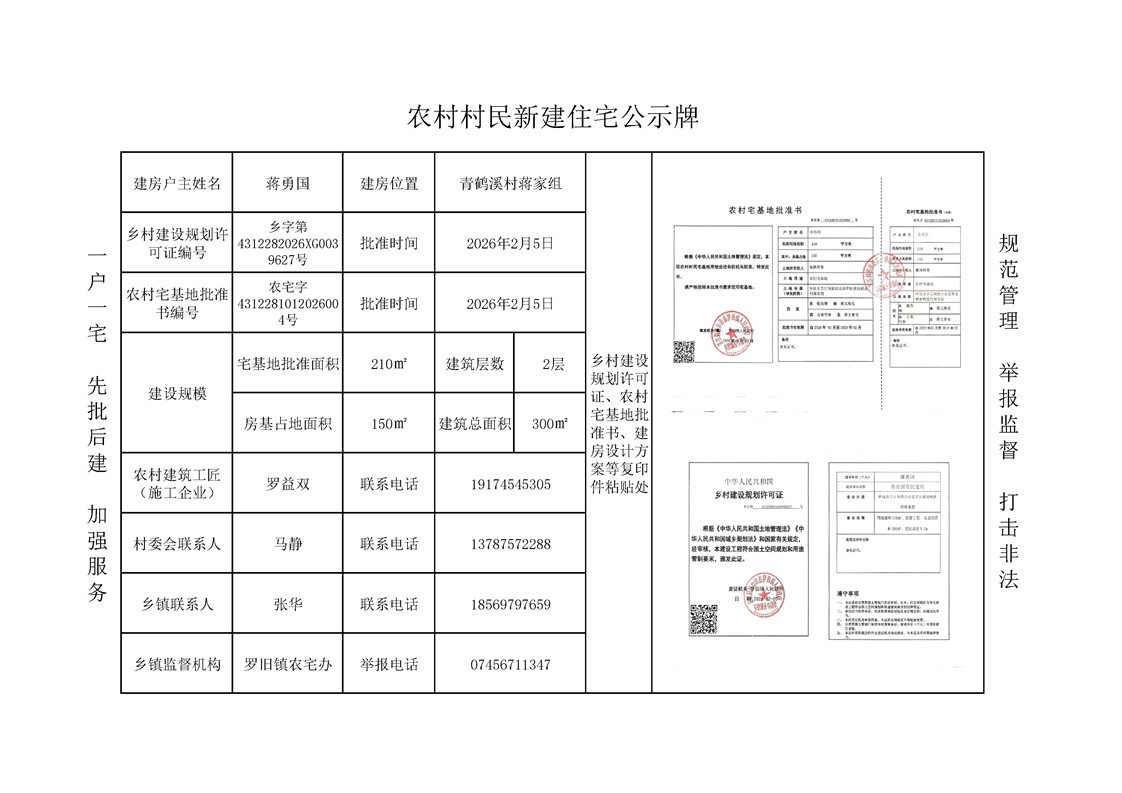 农村村民新建住宅公示牌-青鹤溪村蒋家组-蒋勇国