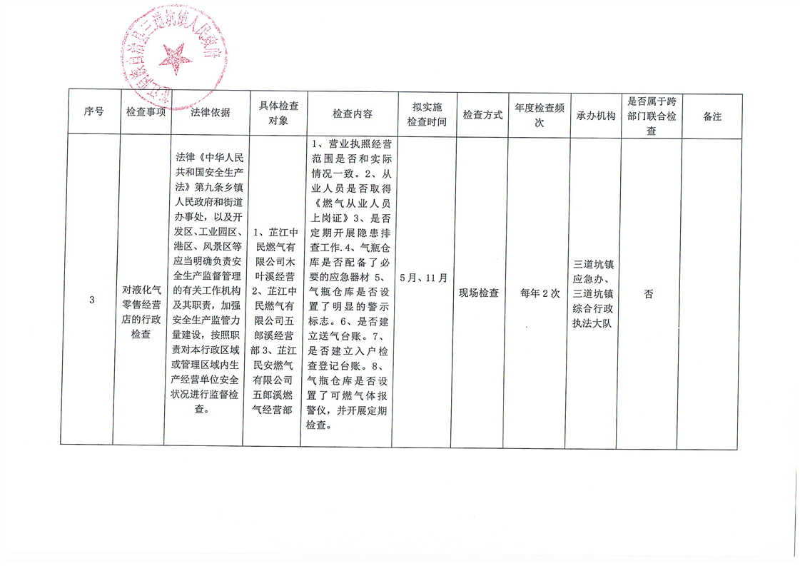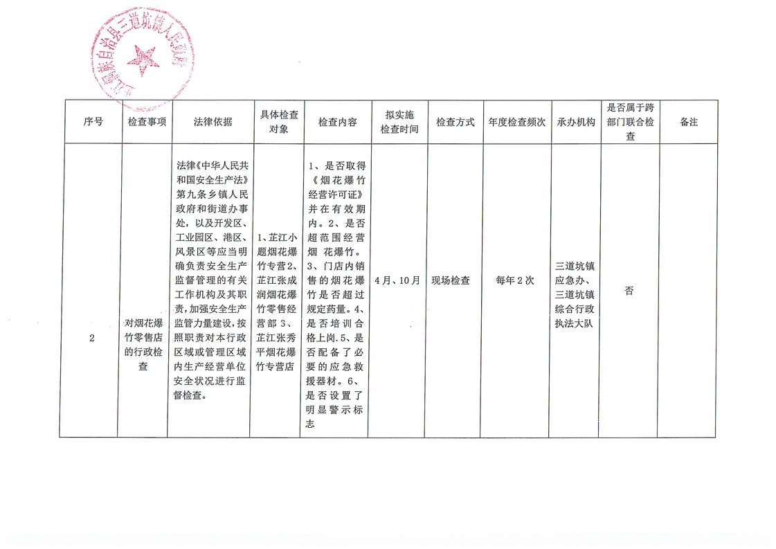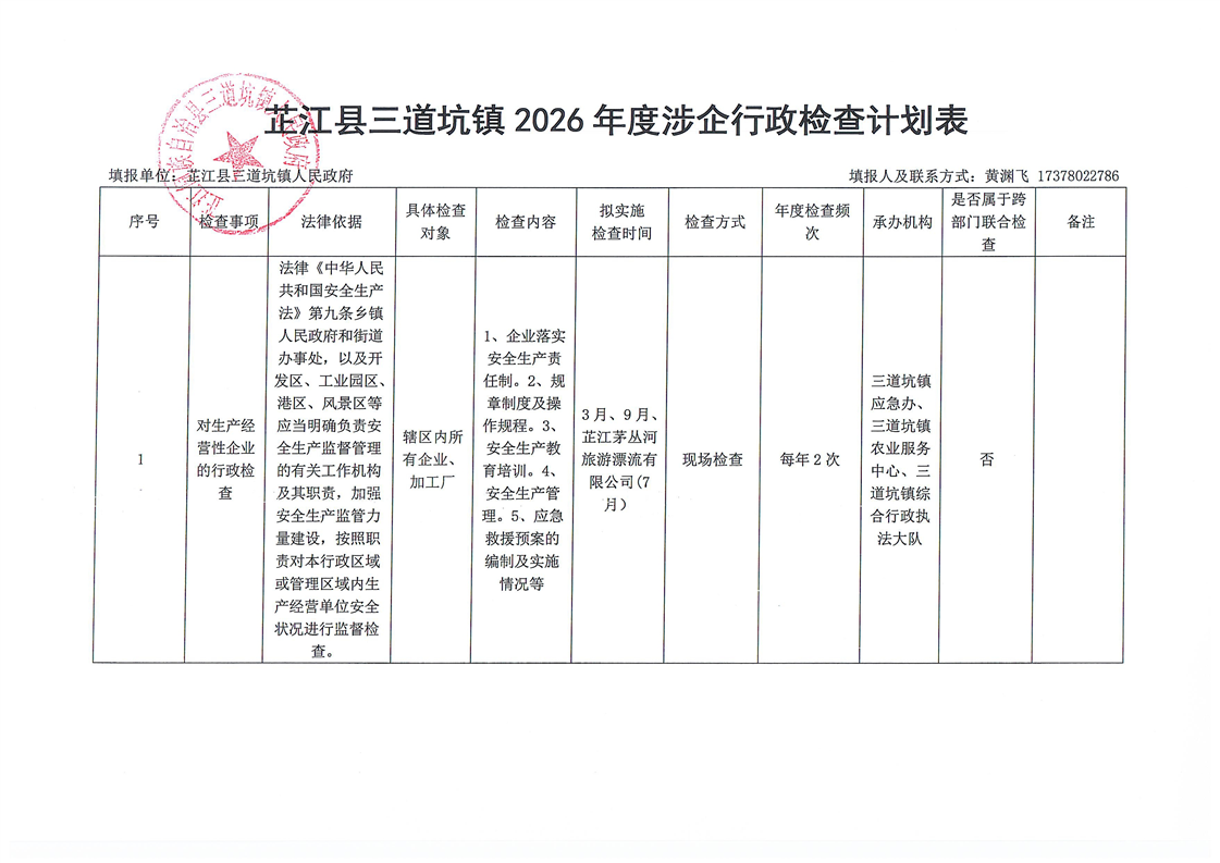 芷江县三道坑镇2026年度涉企行政检查计划表