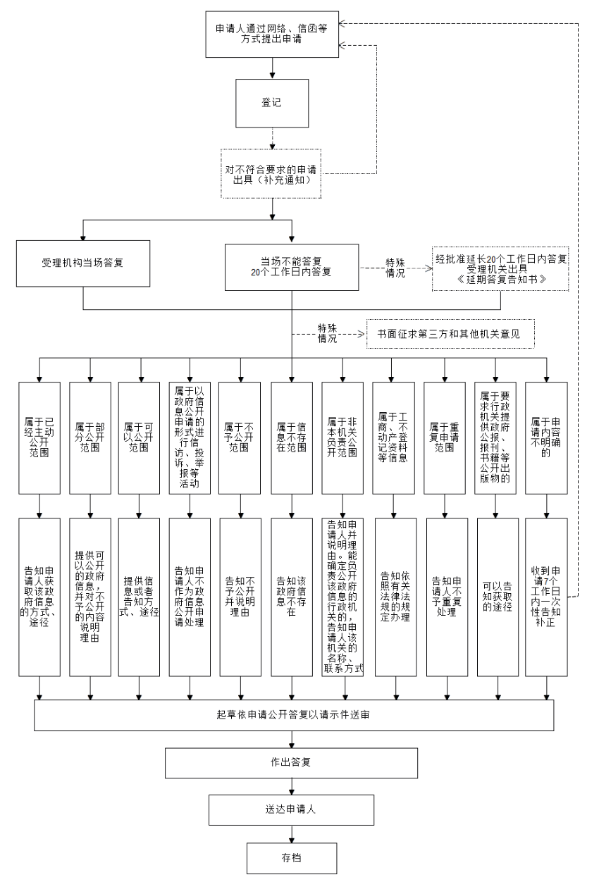 2、收到政府信息公开申请,能够当场答复的,应当当场予以答复,不能当场答复的,应当自收到申请之日起20个工作日内予以答复;需要延长答复期限的,经政务公开分管领导批准同意并书面告知申请人,延长的期限最长不得超过20个工作日。