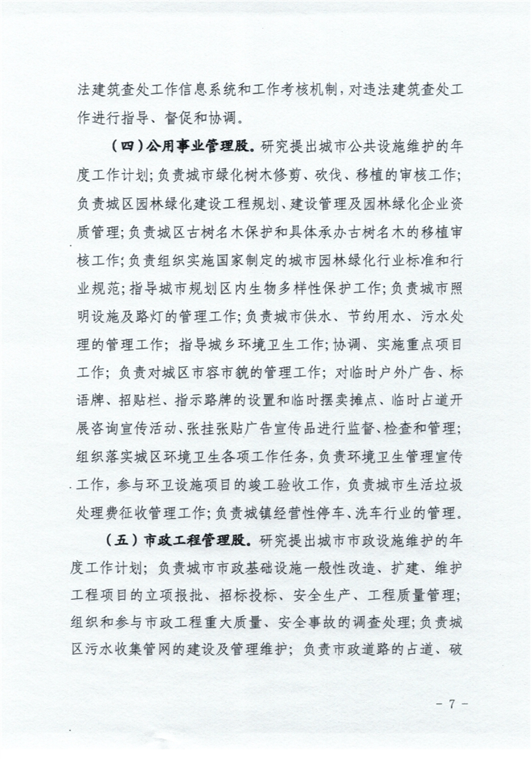 (四)公用事业管理股(股长:蒲春林 联系电话:13907455305)研究提出城市公共设施维护的年度工作计划;负责城市绿化树木修剪、砍伐、移植的审核工作;负责城区园林绿化建设工程规划、建设管理及园林绿化企业资质管理;负责城区古树名木保护和具体承办古树名木的移植审核工作;负责组织实施国家制定的城市园林绿化行业标准和行业规范;指导城市规划区内生物多样性保护工作;负责城市照明设施及路灯的管理工作负责城市供水、节约用水、污水处理的管理工作;指导城乡环境卫生工作;协调、实施重点项目工作;负责对城区市容市貌的管理工作;对临时户外广告、标语牌招贴栏指示路牌的设置和临时摆卖摊点、临时占道开展咨询宣传活动张挂张贴广告宣传品进行监督、检查和管理;组织落实城区环境卫生各项工作任务,负责环境卫生管理宣传工作,参与环卫设施项目的竣工验收工作,负责城市生活垃圾处理费征收管理工作;负责城镇经营性停车、洗车行业的管理,