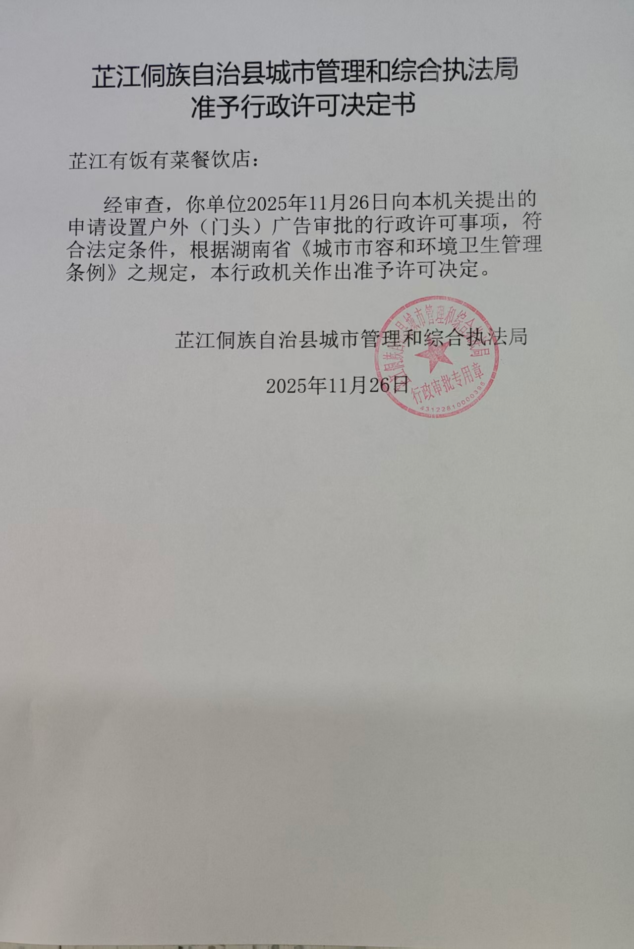 芷江侗族自治县城市管理和综合执法局准予行政许可决定书