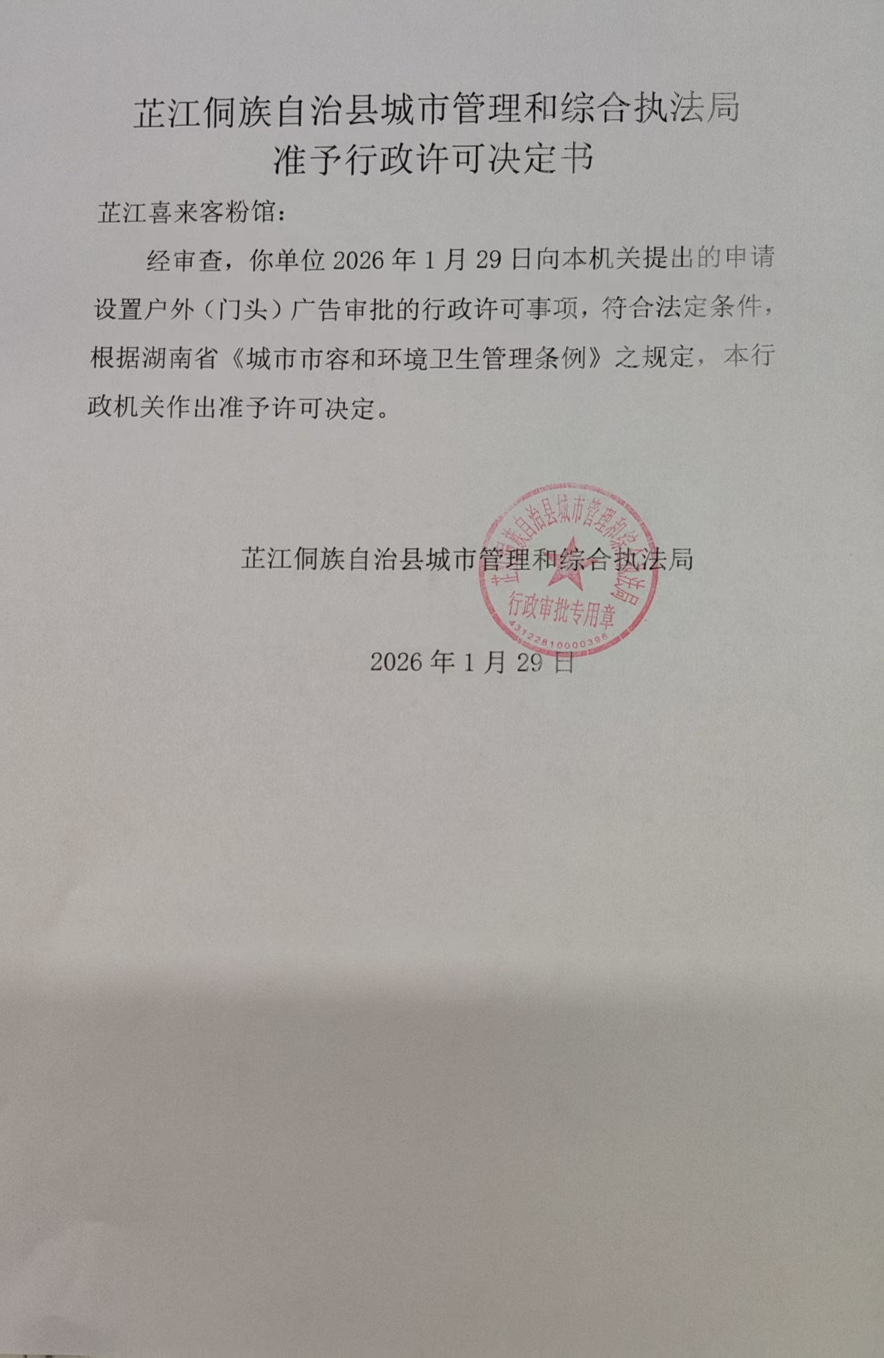 芷江侗族自治县城市管理和综合执法局准予行政许可决定书