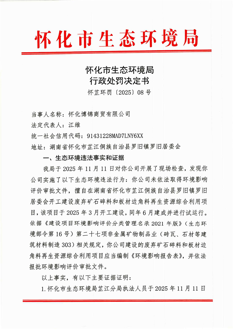怀化市生态环境局行政处罚决定书——怀芷环罚〔2025〕08号