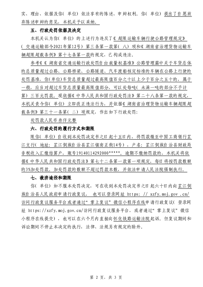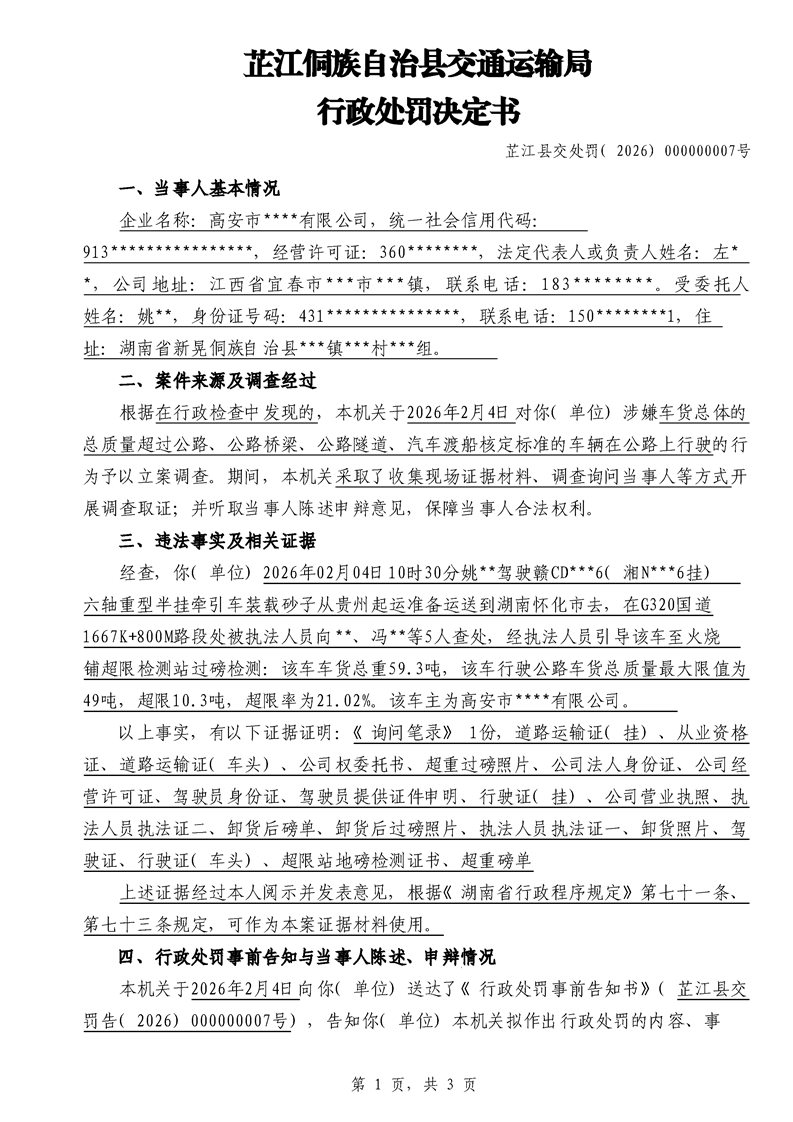 芷江侗族自治县交通运输局行政处罚决定书---湘芷交处罚〔2026〕0007号