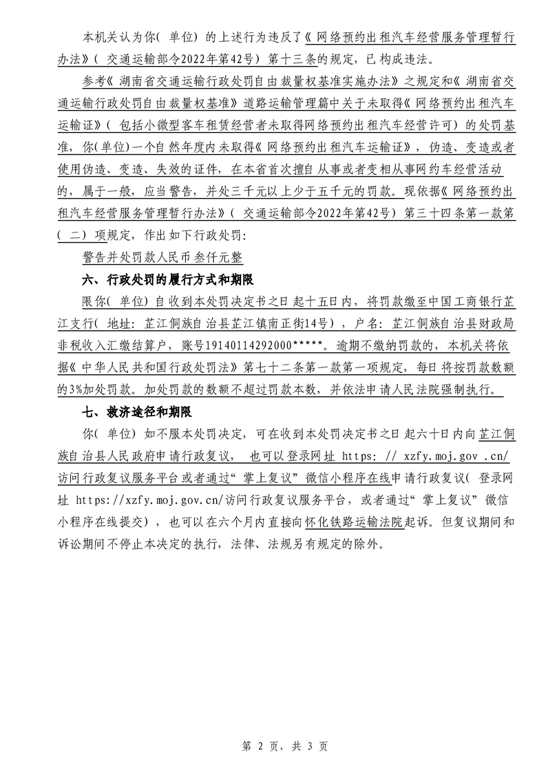 芷江侗族自治县交通运输局行政处罚决定书---湘芷交处罚〔2026〕0002号