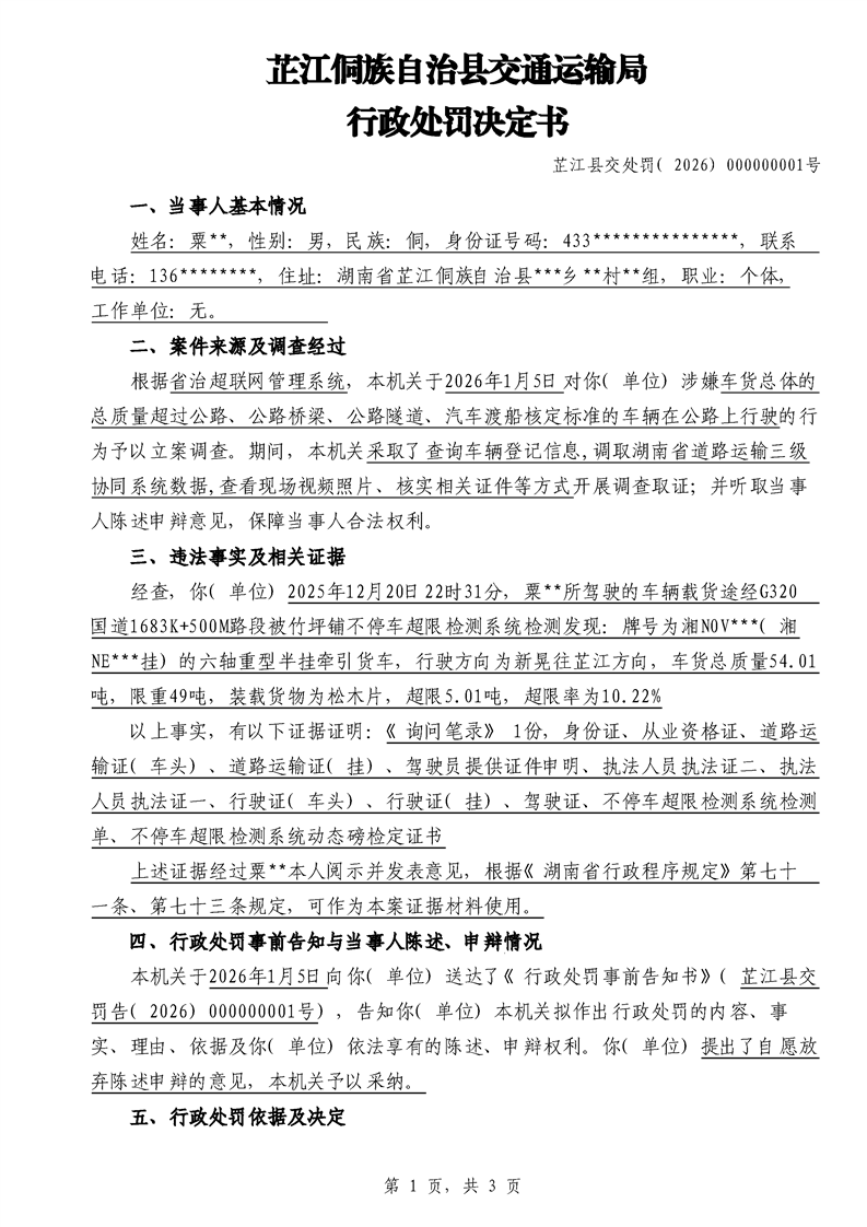 芷江侗族自治县交通运输局行政处罚决定书---湘芷交处罚〔2026〕0001号