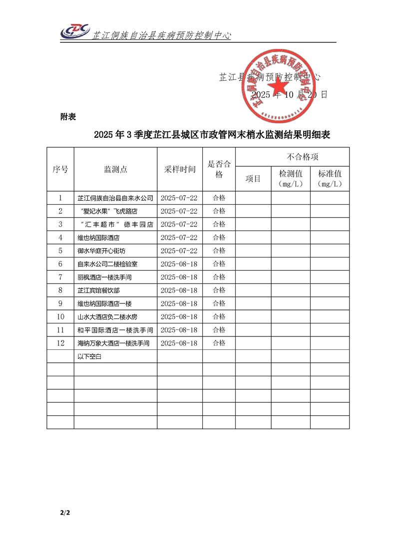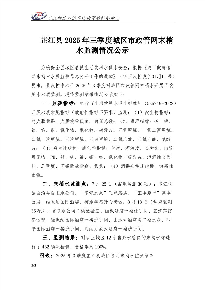 芷江县2025年三季度城区市政管网末梢水监测情况公示