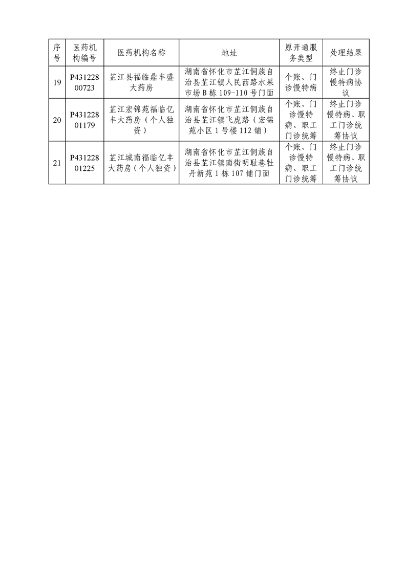 关于芷江瑞康诚中大药房等21家零售药店医保服务协议处理的公告