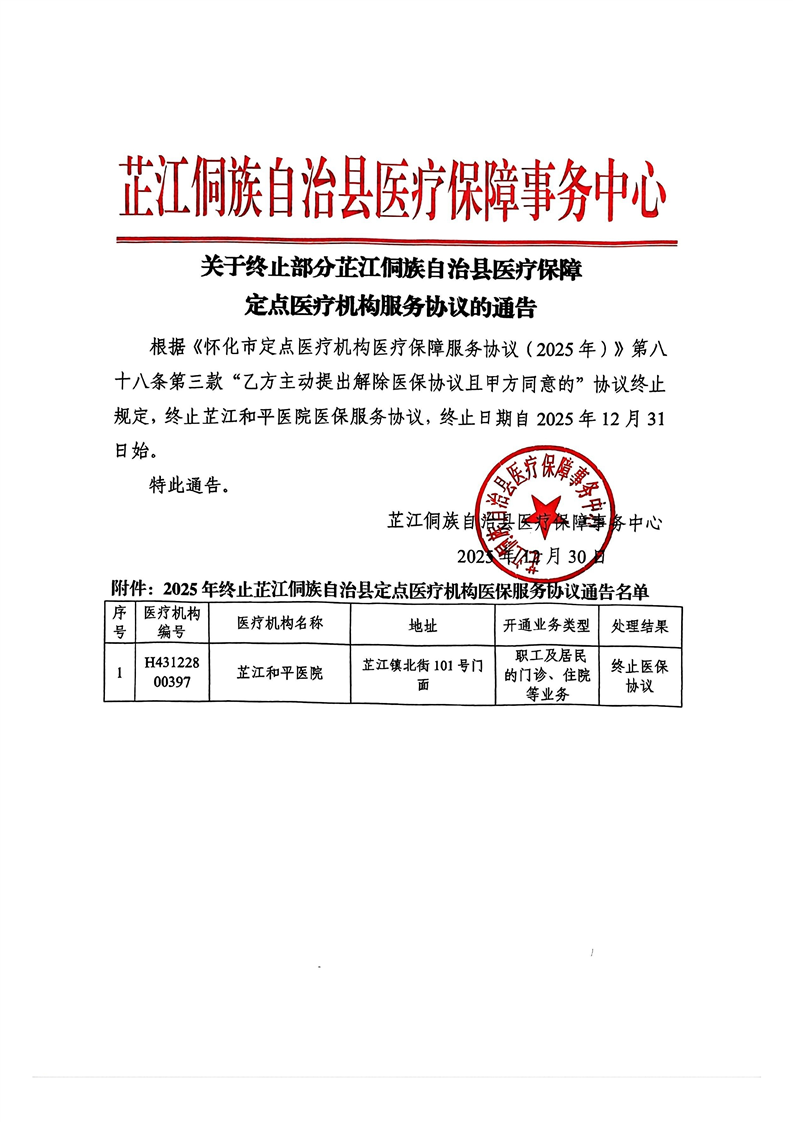 关于终止部分芷江侗族自治县医疗保障定点医疗机构服务协议的通知