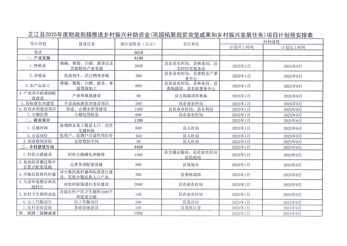 芷江县关于预安排2025年度财政衔接推进乡村振兴补助资金(巩固拓展脱贫攻坚成果和乡村振兴发展任务)项目计划的通知