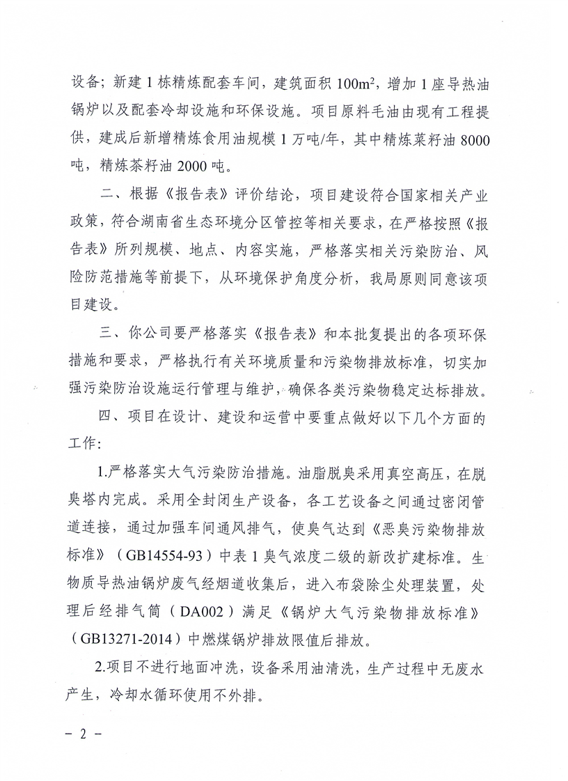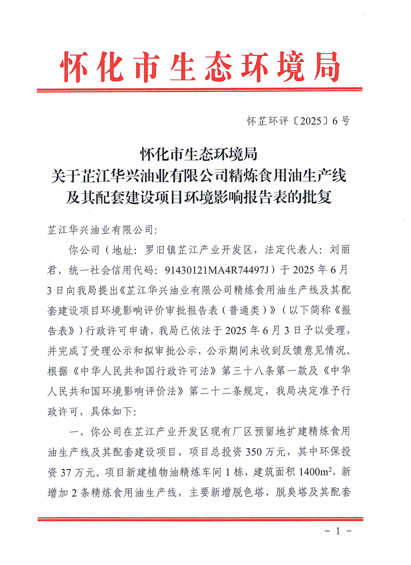 芷江华兴油业有限公司精炼食用油生产线及其配套建设项目环境影响报告表的批复