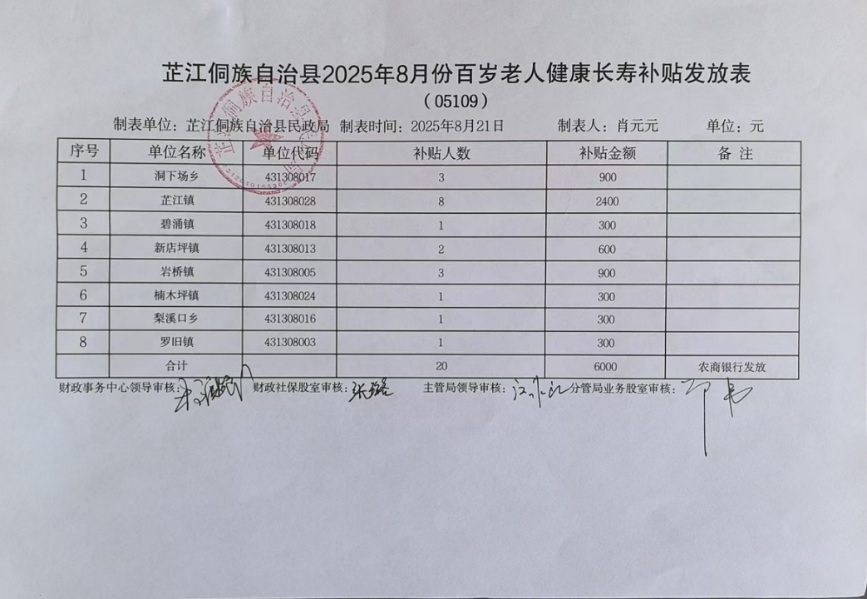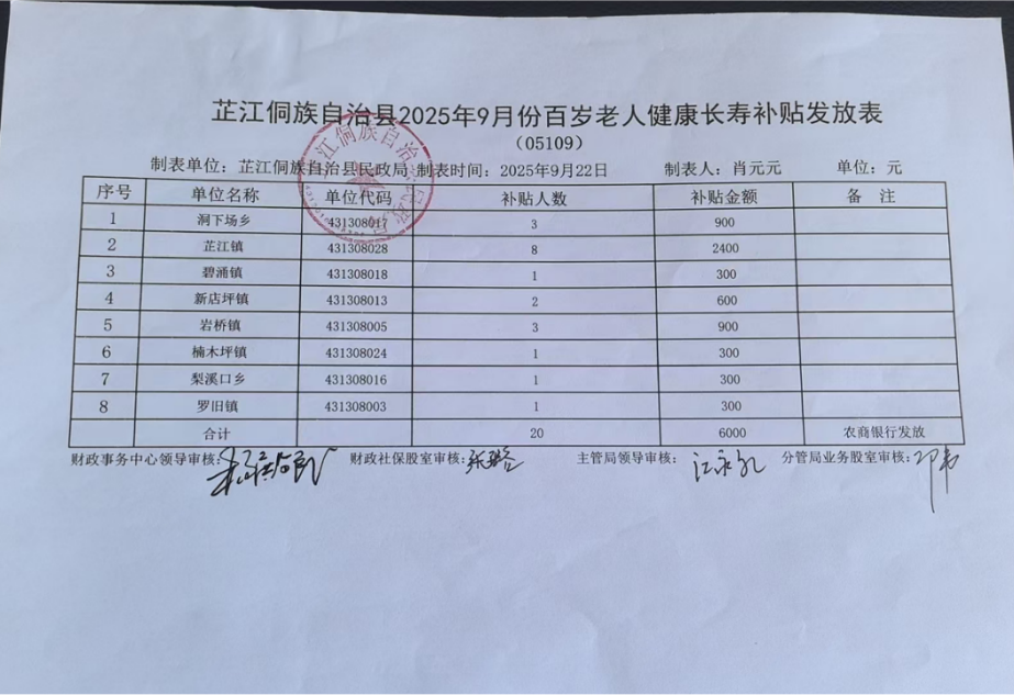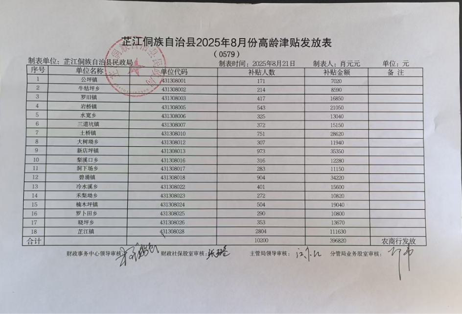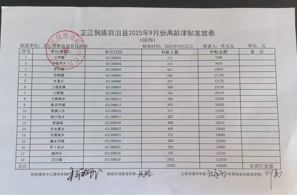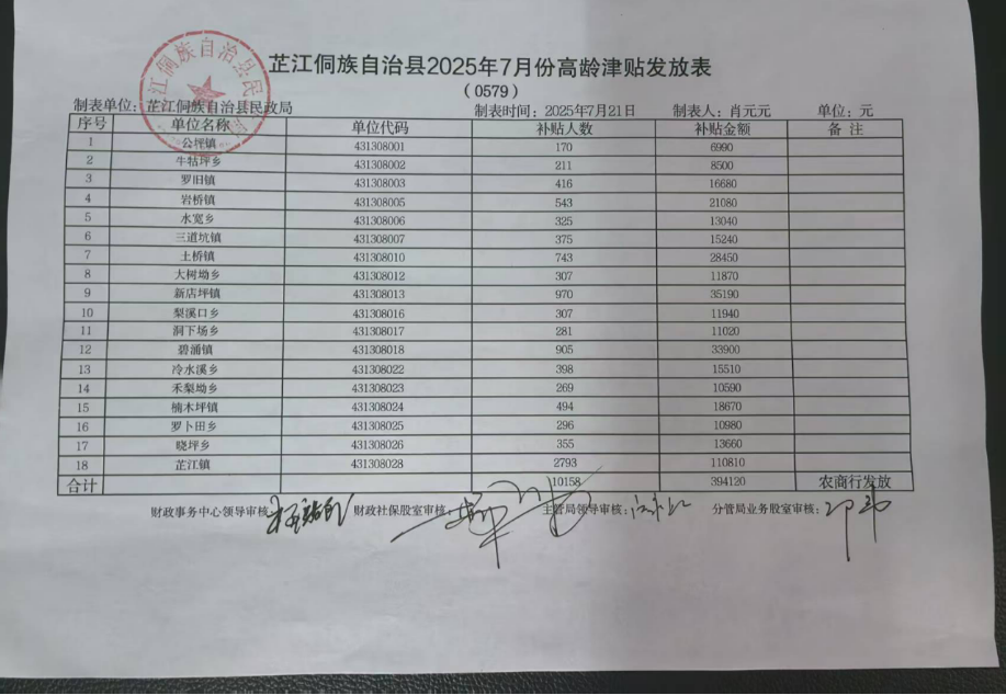 芷江侗族自治县民政局2025年百岁、高龄津贴3季度发放