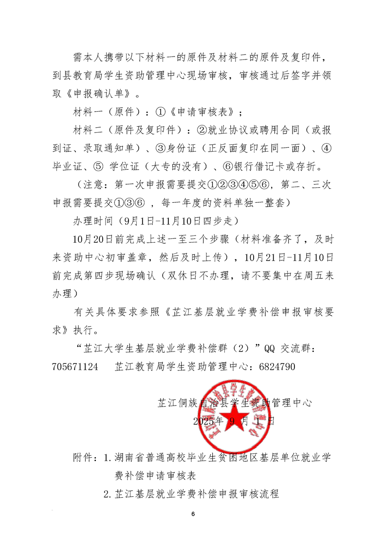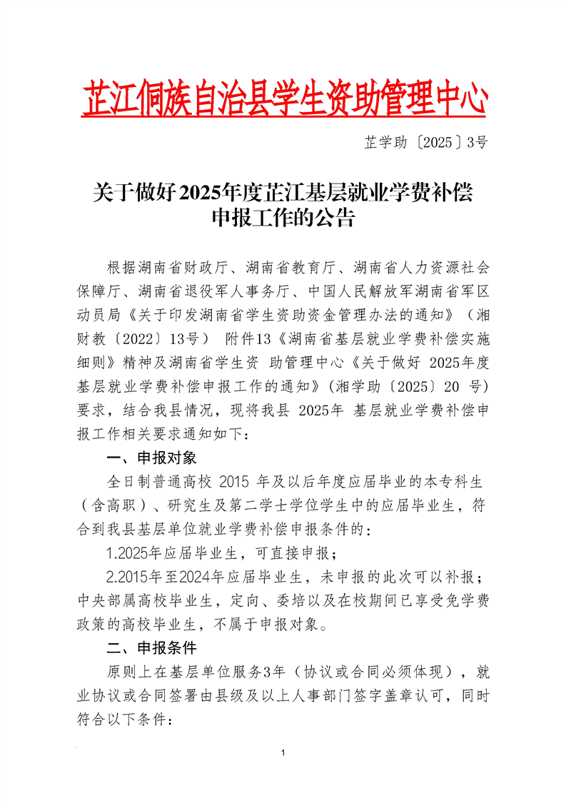 关于做好2025年度芷江基层就业学费补偿申报工作的公告 芷江侗族自治县人民政府 发布时间: 2025-09-03 15:16 相关附件附件:1.湖南省普通高校毕业生贫困地区基层单位就业学费补偿申请审核表、2.芷江基层就业学费补偿申报审核流程.docx 分享到 打印 来源:芷江县教育局