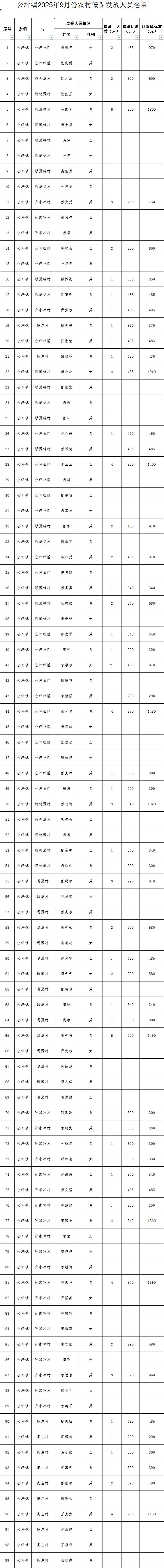 公坪镇2025年9月份农村低保发放人员名单