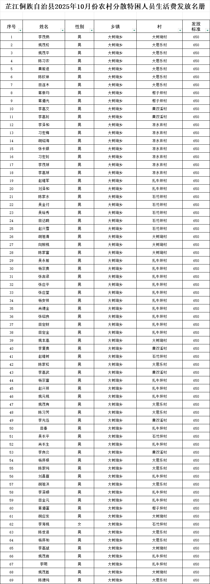【社会救助】大树坳乡2025年10月份农村分散特困人员生活费发放名册
