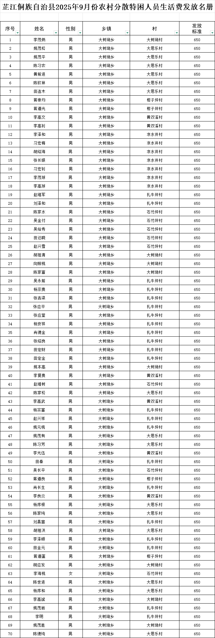 【社会救助】大树坳乡2025年9月份农村分散特困人员生活费发放名册