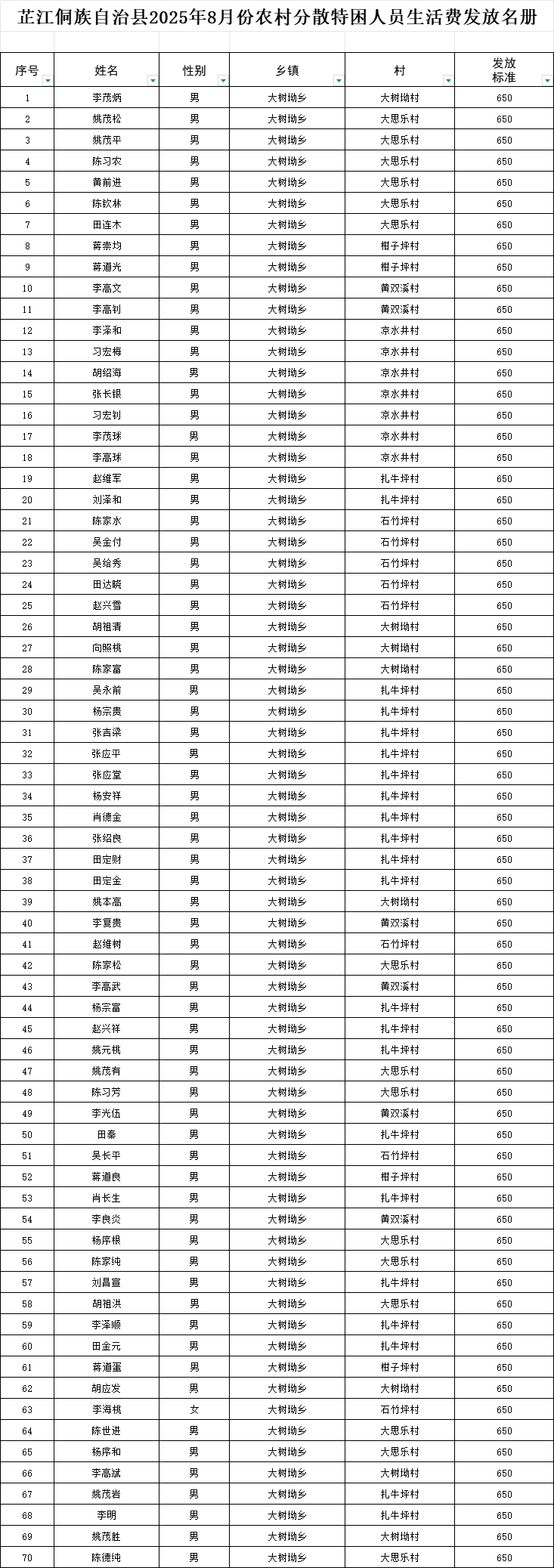 【社会救助】大树坳乡2025年8月份农村分散特困人员生活费发放名册