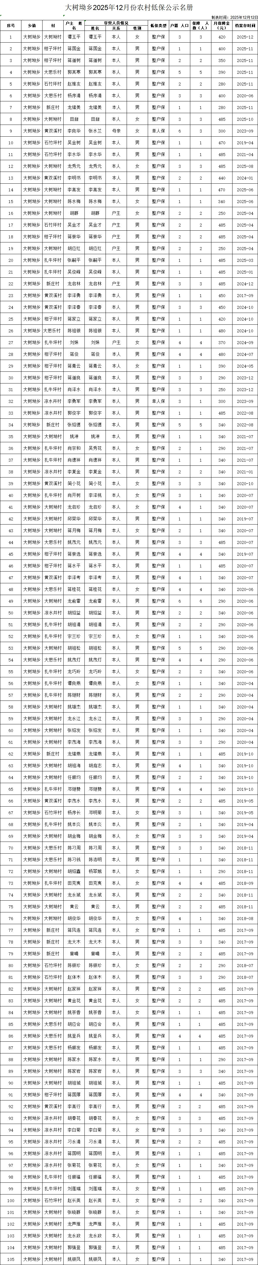 【社会救助】大树坳乡2025年12月份农村低保发放人员名单