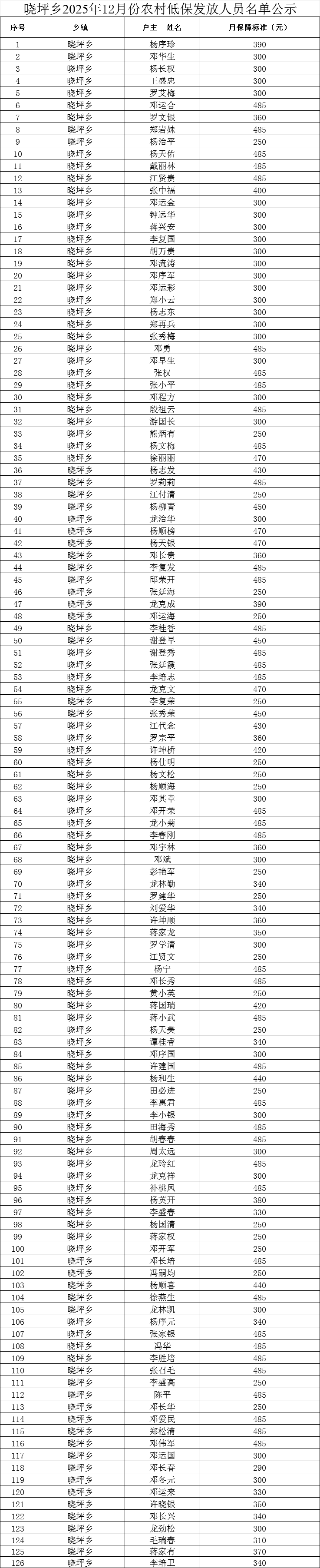 晓坪乡2025年12月份农村低保发放人员名单公示