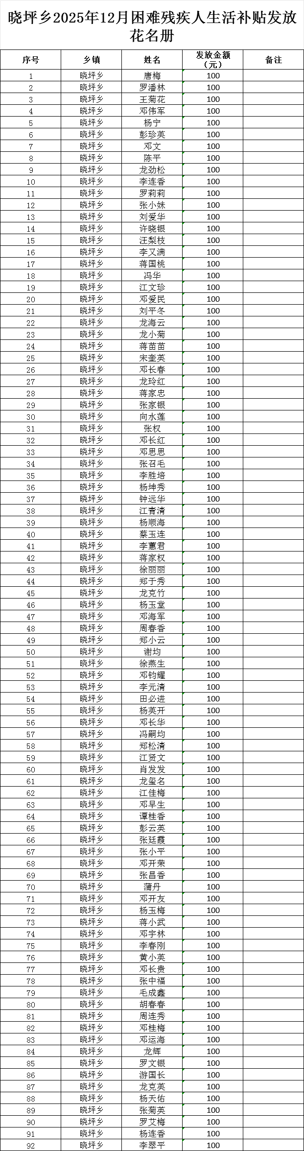 晓坪乡2025年12月困难残疾人生活补贴公示花名册