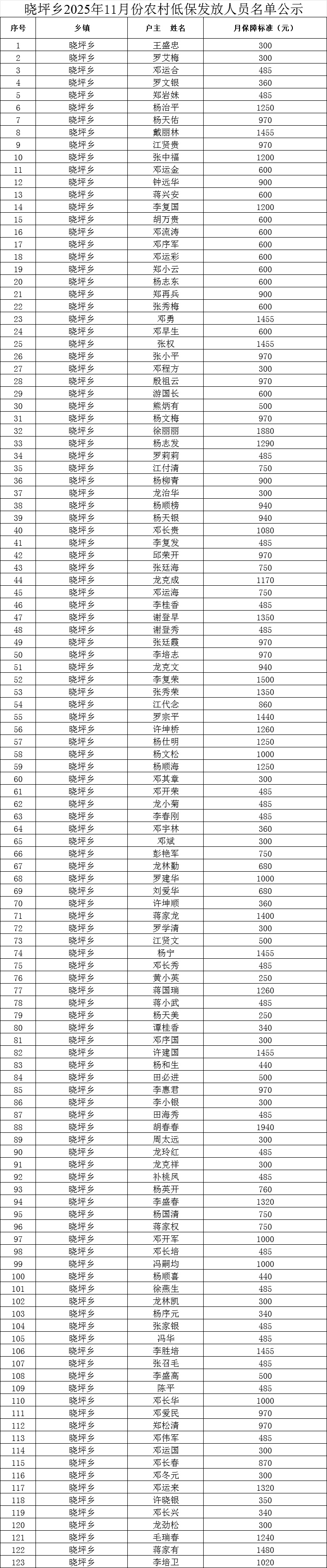 晓坪乡2025年11月份农村低保发放人员名单公示
