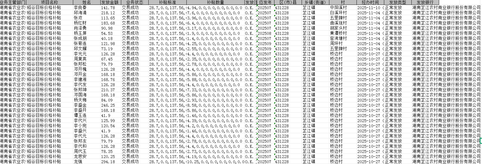 【涉农补贴】2025年芷江镇稻谷补贴发放名册