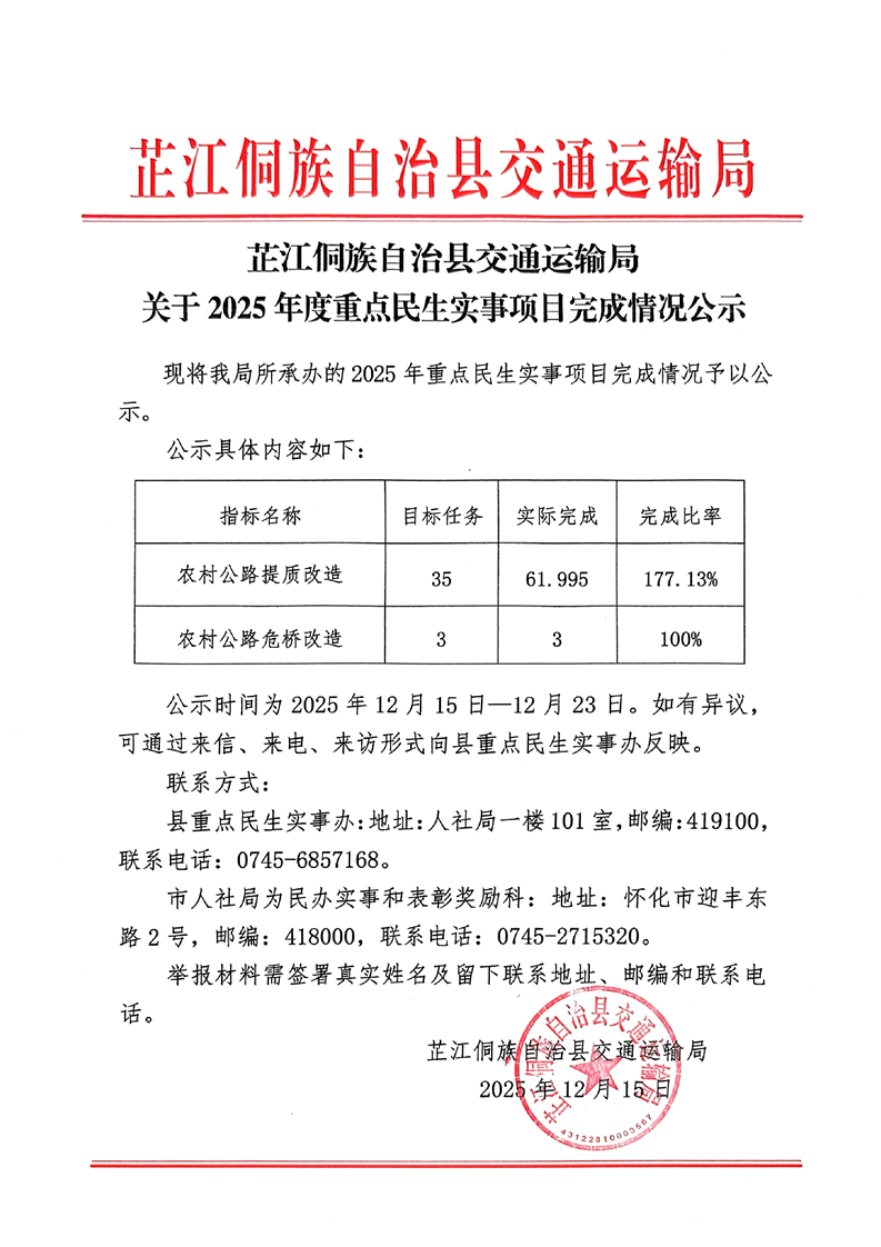 芷江侗族自治县交通运输局关于2025年度重点民生实事项目完成情况公示